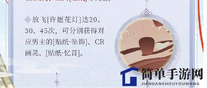 1、挑选你钟爱的男主角色,与他一起放飞[许愿花灯],累计达到特定次数,即可解锁男主动态CR画灵、空间[贴纸]等丰厚奖励。