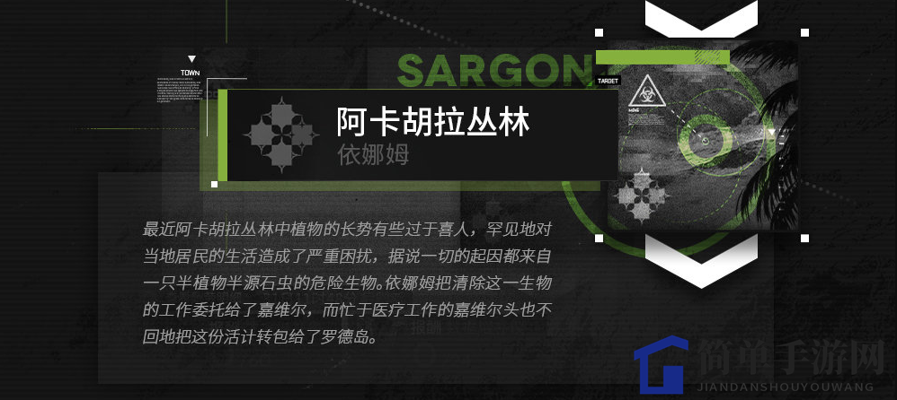 最近,阿卡胡拉丛林中植物生长异常旺盛,严重影响了当地居民的生活。据悉,这一切都是因为一只半植物半源石虫的威胁。依娜姆将清除这只生物的任务交给了嘉维尔,而忙碌的嘉维尔则毫不犹豫地将任务转给了罗德岛。