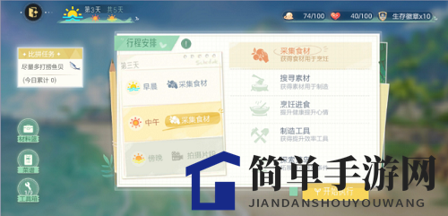在早上和中午采集食材,晚上烹饪进食。请注意:任务卡中所需食材需确保充足,如图所示,鱼贝需保留3个。