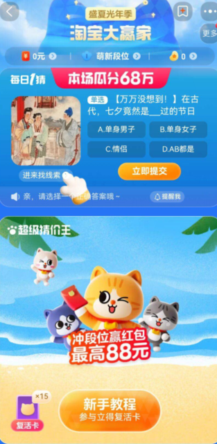 在淘宝大赢家8月20日的欢乐挑战中,七夕节的奥秘被巧妙地融入谜题,吸引了众多玩家热情探寻。今朝,编辑小助手将揭开淘宝大赢家8月20日的谜底,让我们共同揭开这个充满浪漫气息的节日面纱吧!
