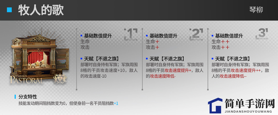 升级效果:军旗周边8格干员的攻击速度提升,同时敌人攻击速度下降幅度加大