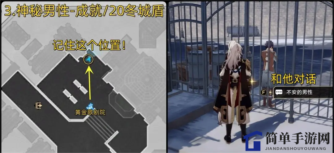 与铁网旁的“神秘男子”对话,利用传送刷新时间,传送并对话循环4次,即可获得成就。