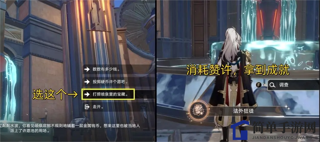 “中央广场”旁的喷泉可以调查,选择捞宝藏选项,提交赞许可获得一个成就。