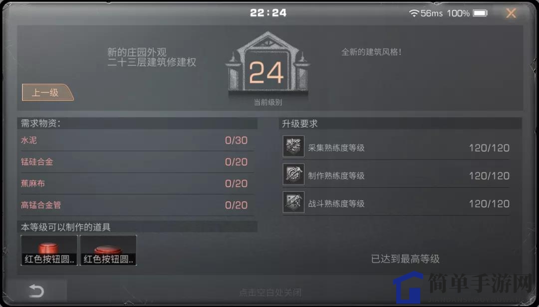 当三维熟练度达成120级,并准备好升级所需物资的幸存者,便可以将庄园顺利升级至24级。