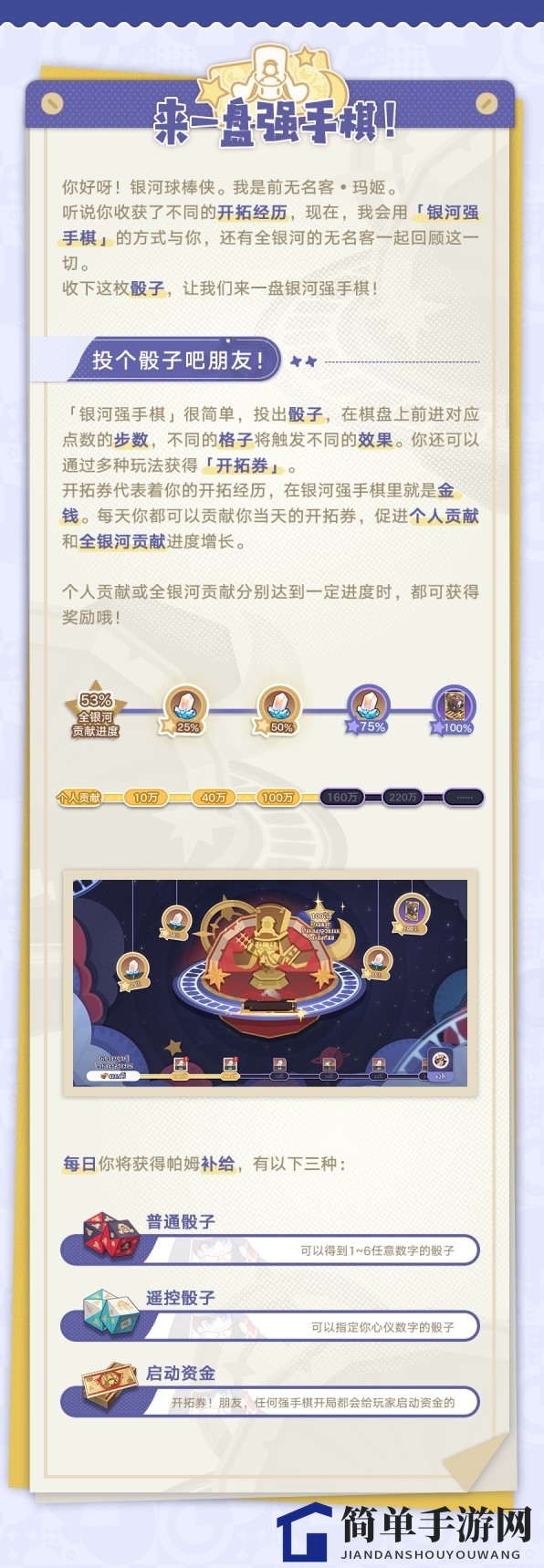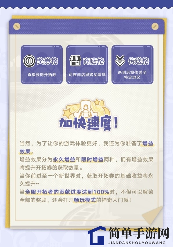 2、活动期间,每日登录即可获得骰子。投掷骰子在地图上前进,参与多种玩法赢取「开拓券」。骰子用尽时,玩家可将累积的「开拓券」进行贡献。